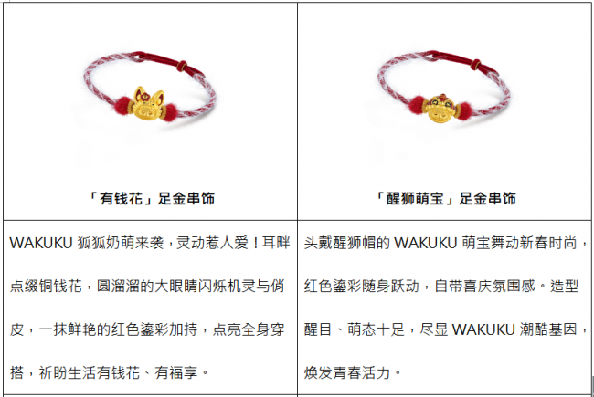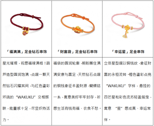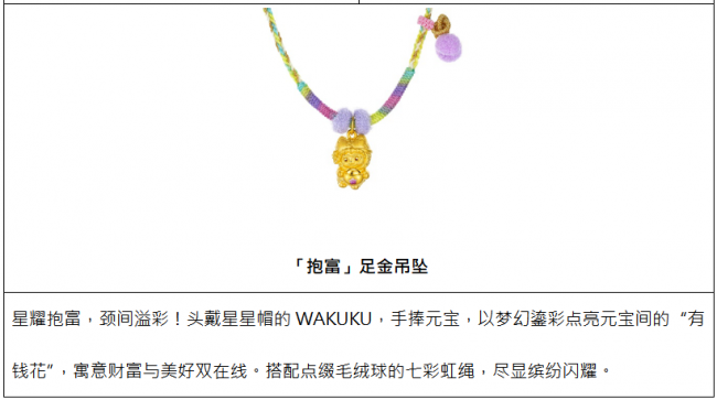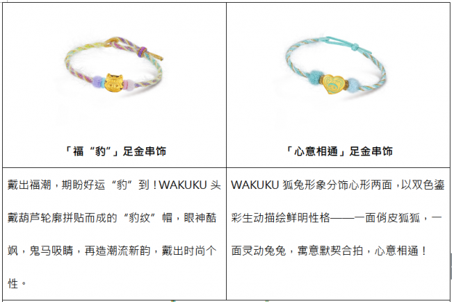 WAKUKU系列涵盖多款萌酷十足的黄金手绳,更特别推出萌暖毛绒手绳与酷感手绳双重选择,满足消费者对个性表达与场景适配的多元需求,风格不设限。萌暖毛绒手绳触感软糯,冬日佩戴温暖舒适,与WAKUKU的可爱气质天然契合,萌力全开!酷感手绳主打简约利落,清爽质感更凸显黄金串饰本身的精致工艺与闪耀光泽,时尚百搭!多款串饰还可自由组合,混搭叠戴。单戴时,祝愿福运聚焦,心意纯粹;叠戴时,祈望福气串联,美好加倍,做到“潮趣由你定义,祝福好运随心叠加”。