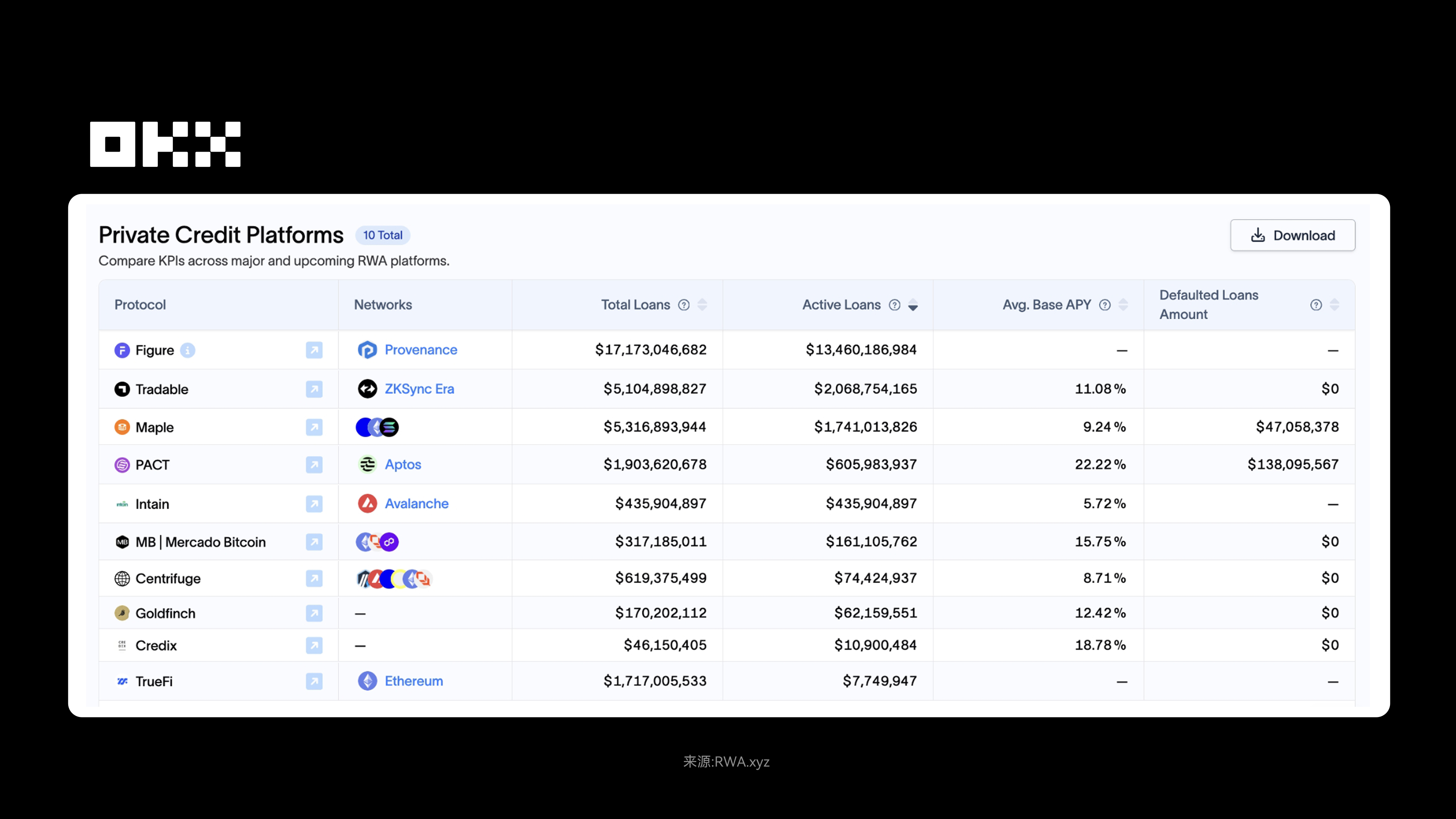 截至2025年11月7日,RWA领域私募信贷活跃贷款规模约186.6亿美元,平均年化利率9.79%,总贷款笔数2,710笔。Figure平台占据约92%市场份额,贷款总额达172亿美元;Centrifuge通过多链架构与DeFi协议互通,TVL从3.5亿美元增长至13亿美元以上,历史年化收益率8%-15%。